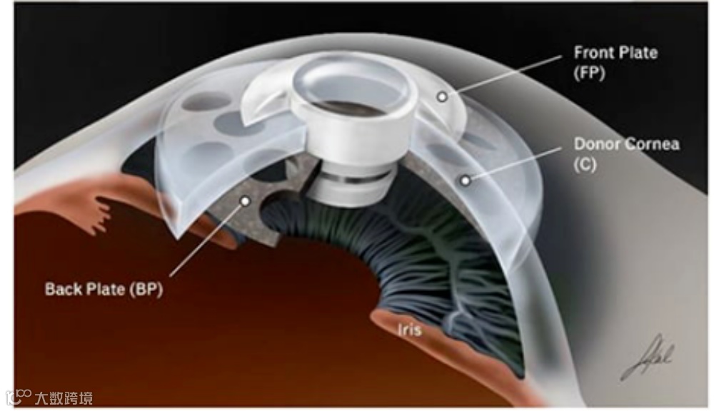 波士顿I型人工角膜结构为“领扣式”设计,主要由PMMA制成,是一种透明的含碳高分子有机化合物,多用于人工晶状体材料,其透光率为92%,屈光指数1.491,质轻、可塑性强、无生物降解。