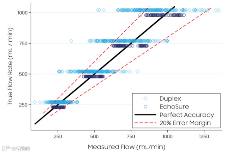 在体积流量、直径和深度的评估中,与 Duplex相比,EchoSure表现出相似或更好的准确性,并且比Duplex更精确。