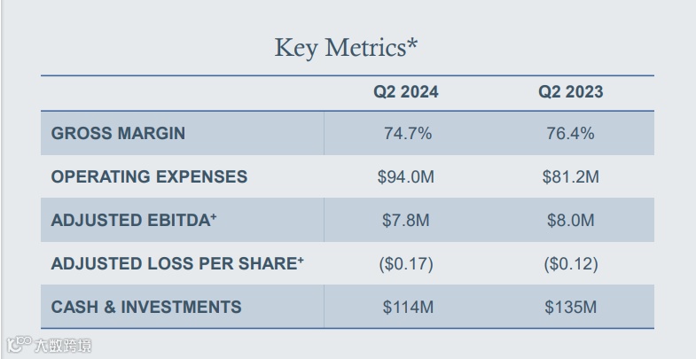 2024 年第二季度的毛利润为 8680 万美元,毛利率为 74.7%,较2023年第二季度下降 168 个基点。