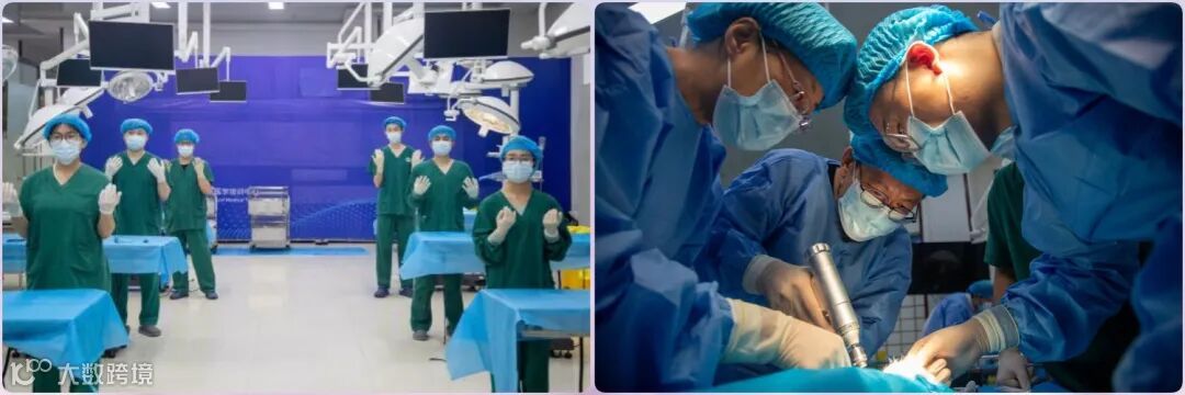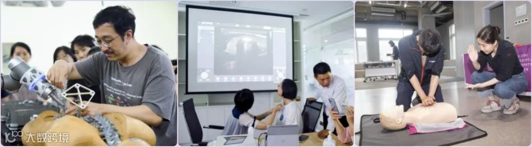 左:骨科手术机器人操作学习 中:掌上B超扫描甲状腺 右:心肺复苏训练