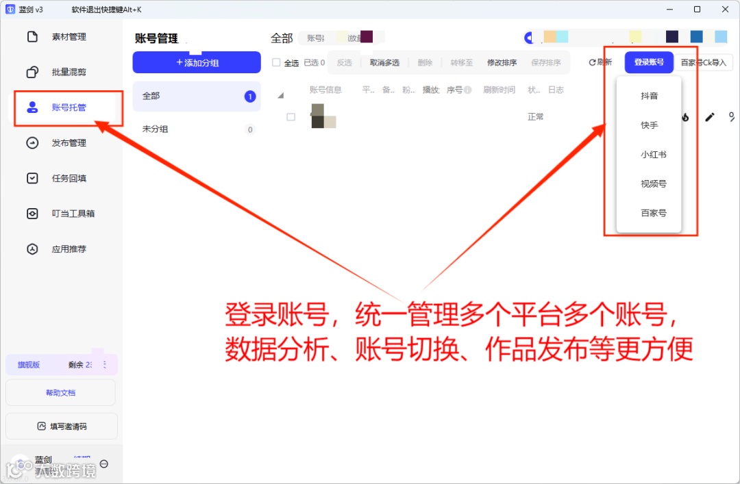 ↪ 账号管理:1人可管理100+账号,实现矩阵运营