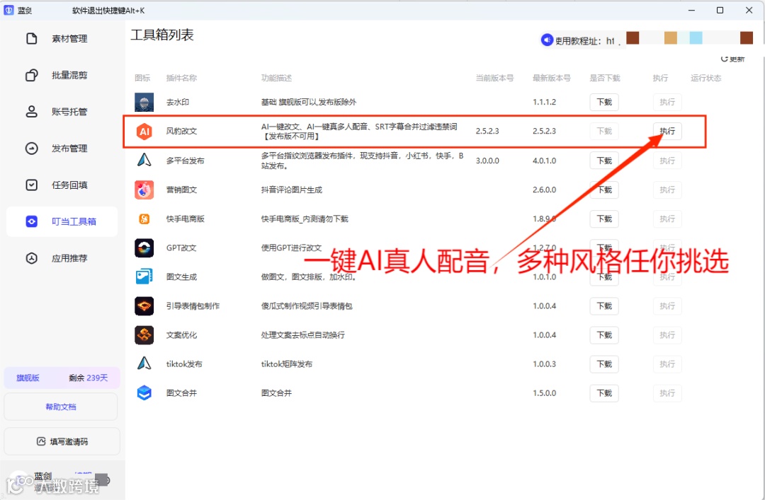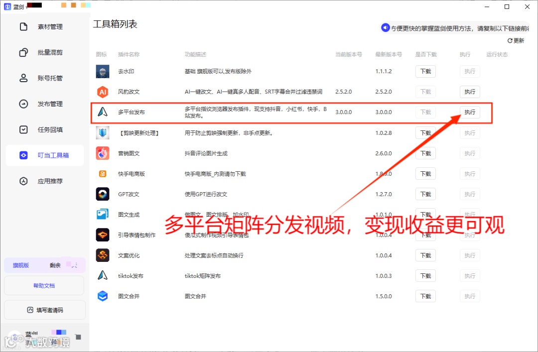 ↪ 批量发布:支持抖音、快手、小红书多平台同步