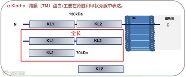 α-Klotho蛋白最初因其在转基因小鼠中调控衰老表型而被发现——缺失该基因的小鼠表现出早衰、血管钙化、骨质疏松等人类典型衰老症状。后续研究证实,α-Klotho是一种跨膜蛋白(分子量130 kDa),主要表达于肾脏和甲状旁腺,其胞外结构域可脱落形成可溶性循环蛋白,直接参与三大生理过程: