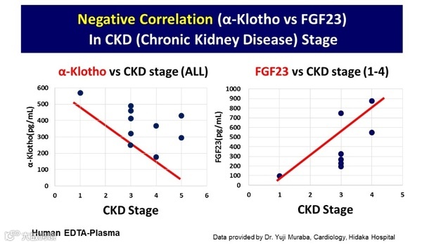 在CKD(慢性肾病)阶段, α-Klotho 与 FGF23负相关