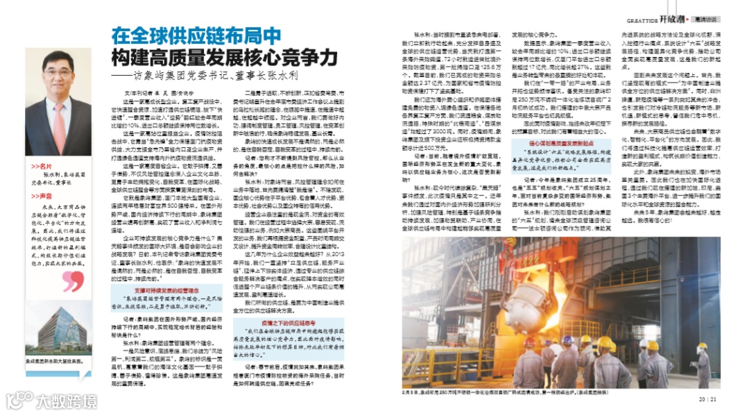 今天,厦门日报社《开放潮》特刊刊登了象屿集团党委书记、董事长张水利专访报道,聚焦集团全球供应链布局、疫情期间复工复产情况,并展望下一个五年高质量发展之路。