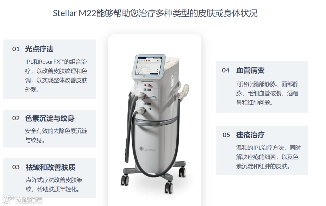 其中,Stellar M22 是 Lumenis科医人公司发布的最新升级款的Stellar IPL超光子嫩肤,具有IPL(OPT)强脉冲光及非剥落点阵激光功能,可以提供600余种不同的治疗模式组合,可用于治疗30多种皮肤问题。