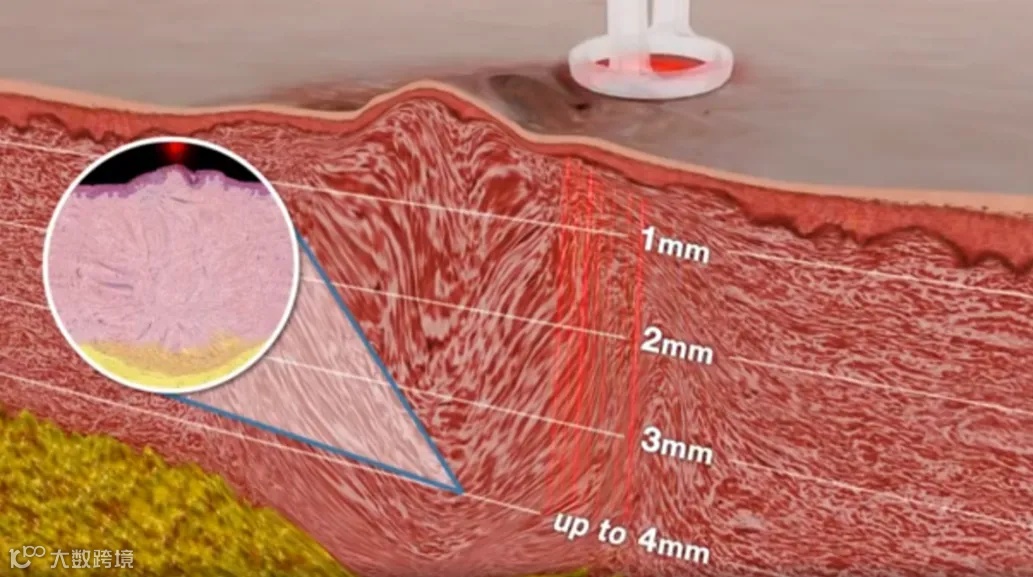 其最大穿透深度可达 4mm, 有效刺激胶原蛋白新生长达 6-12 个月,可改善不同深度和层面的皮肤状况,凹坑回弹效果显著。