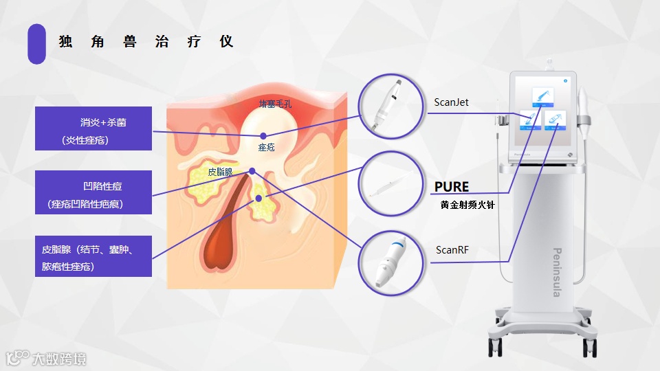 半岛独角兽痤疮治疗仪包括黄金射频火针模块、ScanJet 蓝极光模块、ScanRF黄金点阵模块三大模块。产品适合各种类型痤疮,利用针体部分绝缘的细小黄金微针将射频能量精确作用于皮脂腺,让皮脂腺萎缩、变性,从而达到治疗痤疮的目的 。