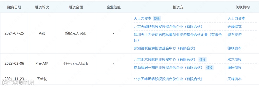 近期,迈微医疗已完成近亿元A轮融资,由天士力资本领投,德联资本和天峰资本跟投。本轮融资将用于核心产品的注册临床试验、商业化和新产品布局。截至发稿日,查询公司融资历程如下: