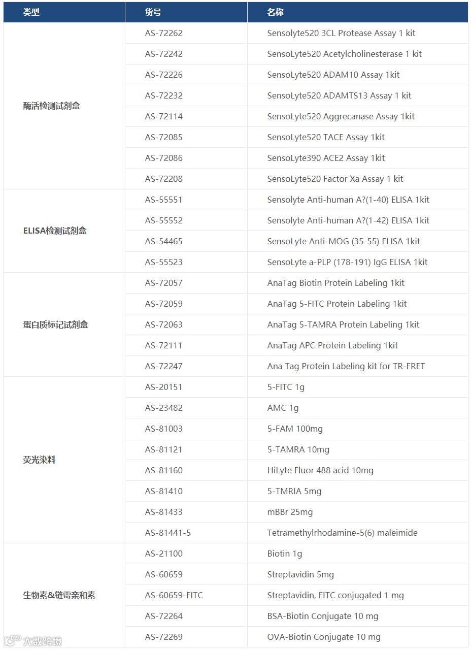 包括荧光染料、生物素标记试剂等,用于生化分析和检测。其SensoLyte系列试剂盒可用于检测多种生物标志物和酶的活性,如HCV、Renin、WNV和Anti-MOG等,这些试剂盒具有更佳的选择性和灵敏度,为科研工作者提供了有力的工具。