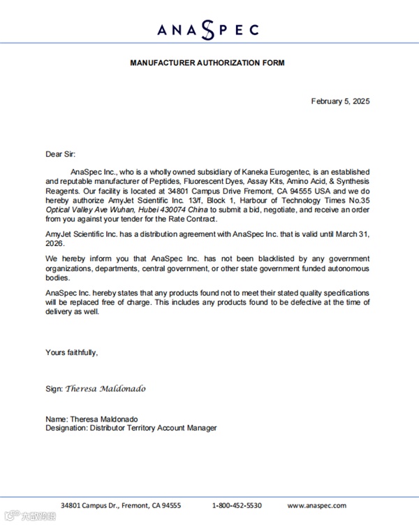 作为AnaSpec在中国的代理商,艾美捷科技有限公司将为中国客户提供全面的AnaSpec以及客户订制化服务。更多AnaSpec产品,欢迎大家随时联系艾美捷科技。