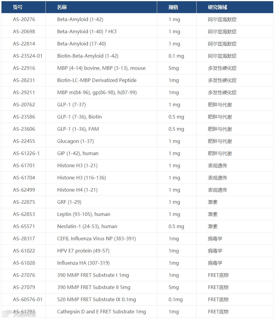 AnaSpec提供多种多肽产品,包括beta淀粉样肽、FRET肽、多发性硬化症(MS)疾病相关肽和组蛋白肽等。这些多肽在疾病研究、药物筛选和诊断试剂的开发中具有重要的应用价值。