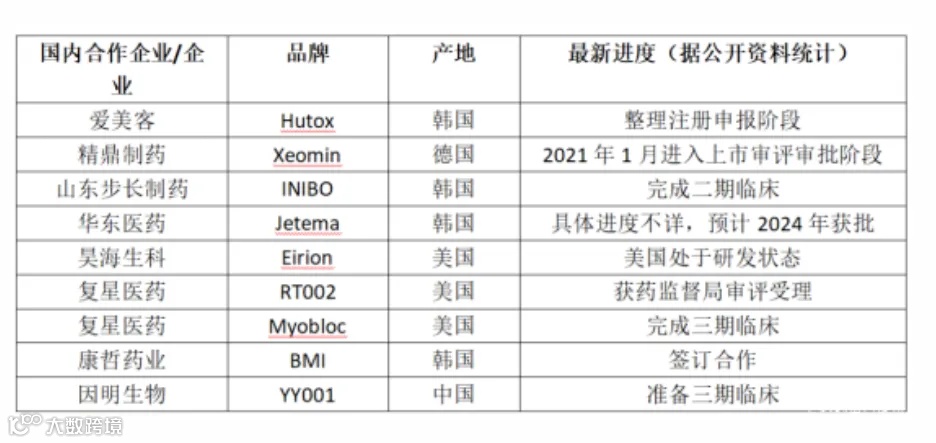 在临床研究方面,中国目前有六家企业的注射类肉毒素产品在进行临床试验,其中四家的产品已经进入了Ⅲ期临床阶段。华东医药在2023年10月与韩国ATGC公司签署了肉毒素产品的独家使用权协议,随后在11月与重庆誉颜达成了注射用重组A型肉毒毒素YY001的独家销售协议,从而建立了深层次的合作关系。