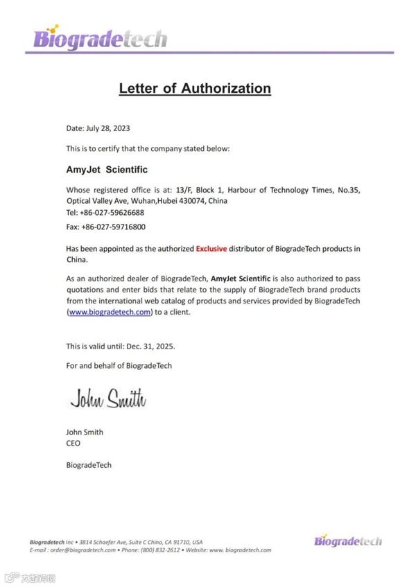作为Biogradetech在中国的区域独家代理,艾美捷科技有限公司将为中国客户提供全面的Biogradetech的产品。下图为Biogradetech公司授权艾美捷科技有限公司(AmyJet Scientific Inc.)作为Biogradetech在中国区域的独家代理授权书。