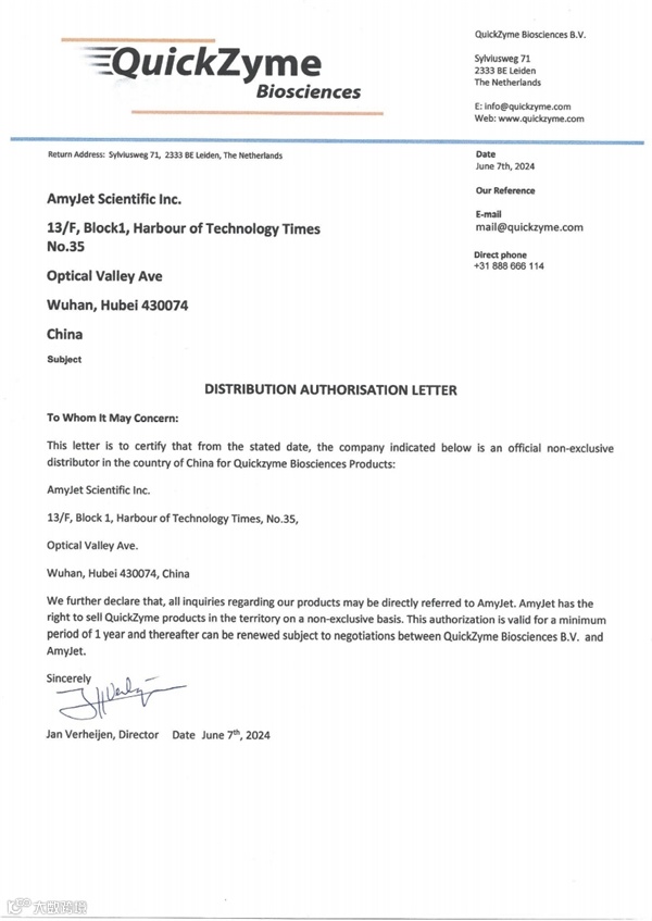 作为QuickZyme Biosciences在中国的区域总代理,艾美捷科技有限公司将为中国客户提供全面的QuickZyme Biosciences以及客户订制化服务。欢迎大家随时联系我们。