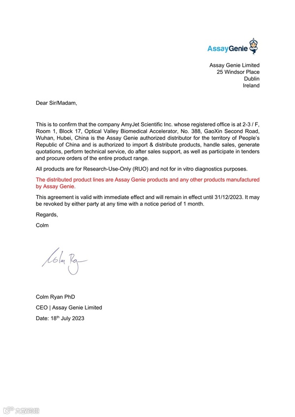 作为Assay Genie在中国区域的代理,艾美捷科技有限公司将为中国客户提供全面的Assay Genie产品。下图为Assay Genie授权艾美捷科技有限公司(AmyJet Scientific Inc.)作为Assay Genie在中国区域的代理授权书。