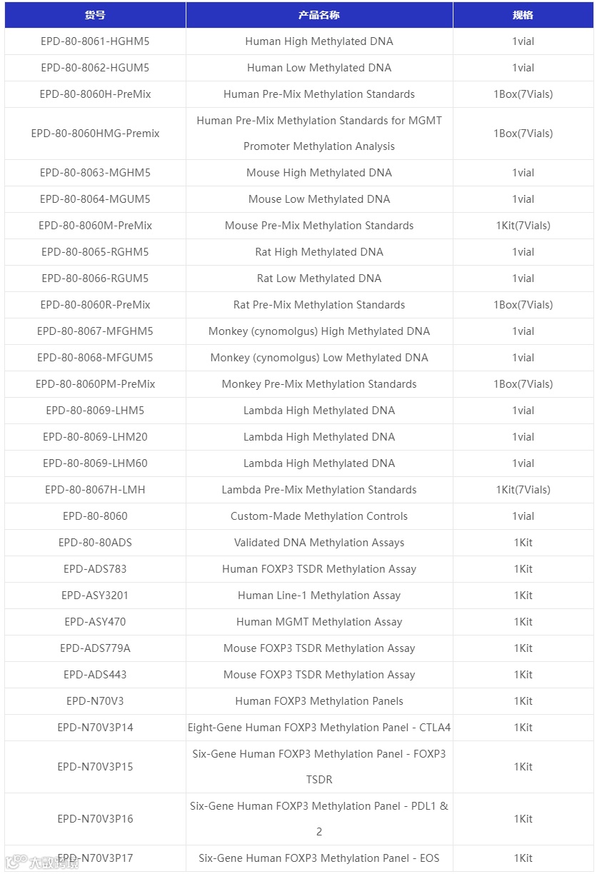 EpigenDx专注于DNA甲基化分析产品,如用于甲基化研究的甲基化对照,甲基化盘和验证的引物组。