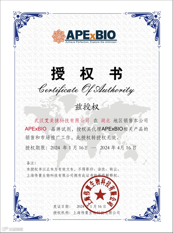 作为APExBIO在中国区域的代理,艾美捷科技有限公司将为中国客户提供全面的APExBIO产品。下图为APExBIO授权艾美捷科技有限公司(AmyJet Scientific Inc.)作为APExBIO在中国区域的代理授权书。
