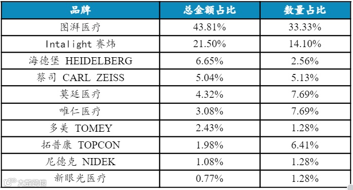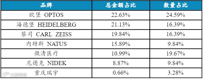 中标总数量方面,欧堡排名第一,中标数量占比24.59%;微清排名第二,中标数量占比19.67%,海德堡与蔡司并列第三,中标数量占比16.39%。