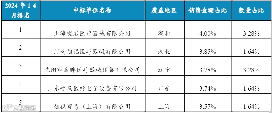 根据中标结果,2024年1-4月总销售额最高的中标单位是上海视岩医疗器械有限公司,销售金额占比4.00%;河南旭福医疗器械有限公司排名第二,销售金额占比3.85%;排名第三的是沈阳市赢眸医疗器械销售有限公司,销售金额占比3.78%。