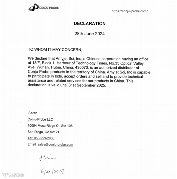 作为Conju-Probe在中国区域总代理,艾美捷科技有限公司将为中国客户提供全面的Conju-Probe产品以及客户订制化服务,欢迎大家随时联系我们。