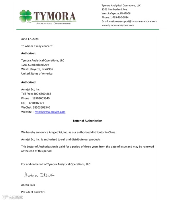 下图为 Tymora Analytical Operations授权艾美捷科技有限公司(AmyJet Scientific Inc.)作为Tymora Analytical Operations在中国区域的代理授权书。