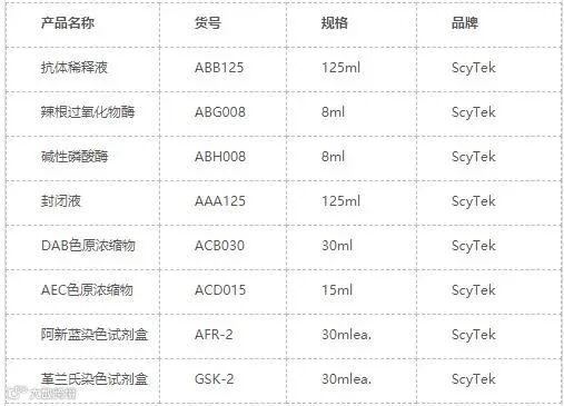 ScyTek公司的ELISA试剂包括显色底物,结合物稳定剂,封闭缓冲液,稀释液和漂洗缓冲剂,免疫组织化学试剂包括SensiTek和UltraTek检测系统以及单克隆和多克隆一抗,组织学试剂包括许多特殊染色试剂盒,常规染色试剂盒,固定剂,封片剂,漂洗缓冲液以及染色设备。