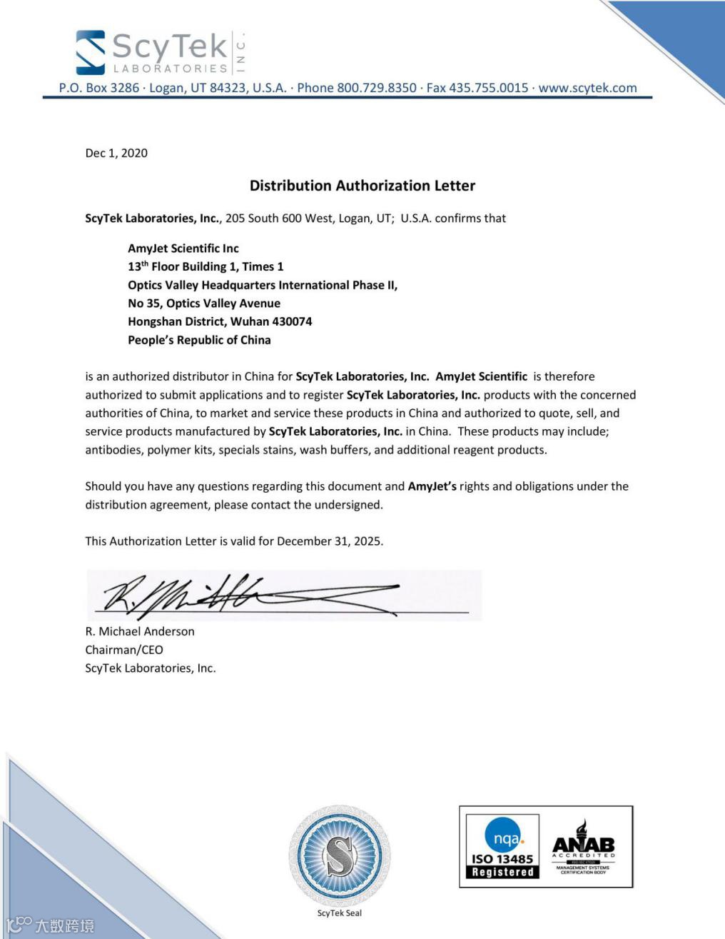 作为ScyTek在中国的区域总代理,艾美捷科技有限公司将为中国客户提供最全面的ScyTek产品。下图为ScyTek公司授权艾美捷科技有限公司(AmyJet Scientific Inc.)作为ScyTek在中国区域的代理授权书。