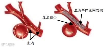 血流导向密网支架主要是通过其高金属覆盖率和高网孔率设计,对局部血流进行重塑,将载瘤动脉向动脉瘤内的冲击血流导向远端正常血管内,从而减少局部血流对动脉瘤的冲击,使动脉瘤内的血流动力学情况得以改善,最终在动脉瘤内形成血栓,进而实现动脉瘤的闭塞。