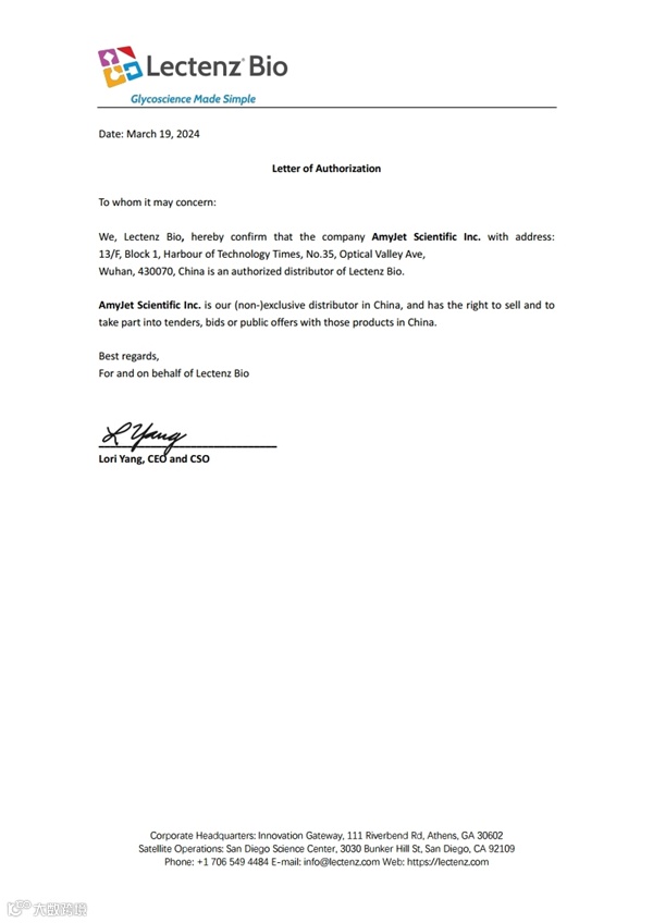 作为Lectenz Bio在中国的区域总代理,艾美捷科技有限公司将为中国客户提供全面的Lectenz Bio的产品。下图为Lectenz Bio公司授权艾美捷科技有限公司(AmyJet Scientific Inc.)作为Lectenz Bio在中国区域的代理授权书。