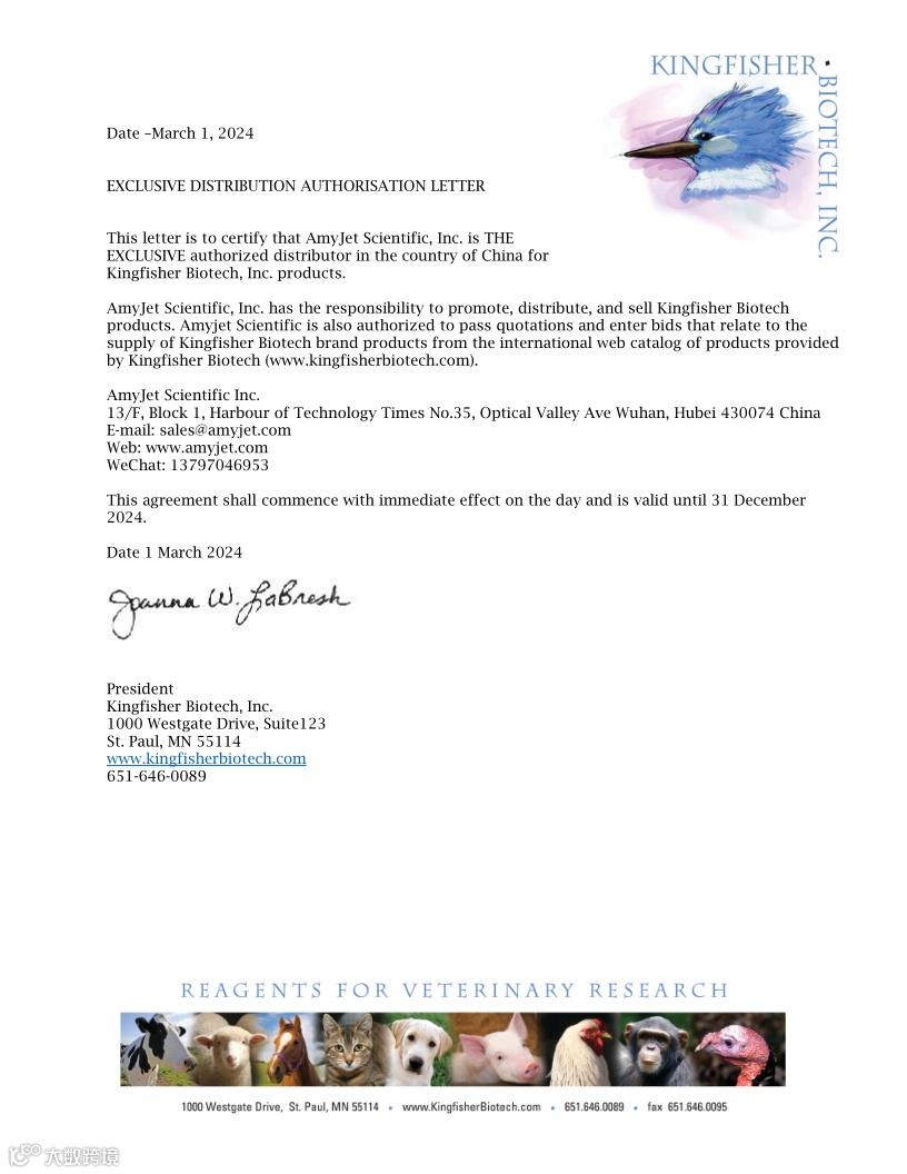 作为Kingfisher Biotech独家代理,艾美捷科技有限公司将为中国客户提供全面的Kingfisher Biotech的产品。下图为Kingfisher Biotech公司授权艾美捷科技有限公司(AmyJet Scientific Inc.)作为Kingfisher Biotech在中国区独家代理授权书。