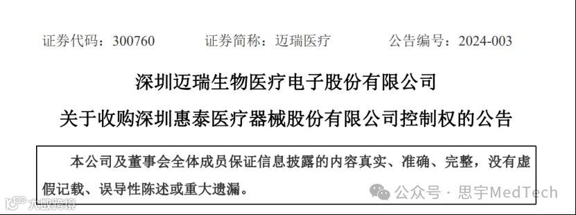 2024年1月28日,国产医疗器械龙头迈瑞医疗宣布,公司拟使用66.5亿元自有资金实现对科创板上市医疗器械公司惠泰医疗(688617.SH)控制权的收购,快速布局心血管领域细分赛道。