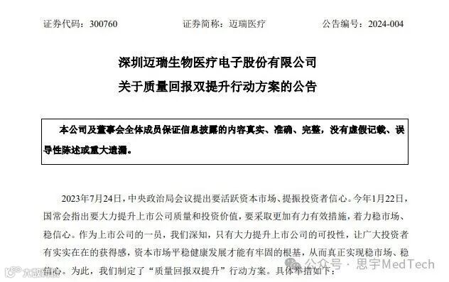 2024年2月18日,深圳迈瑞生物医疗电子股份有限公司发布了“关于质量回报双提升行动方案的公告”,一共包括六项具体举措。