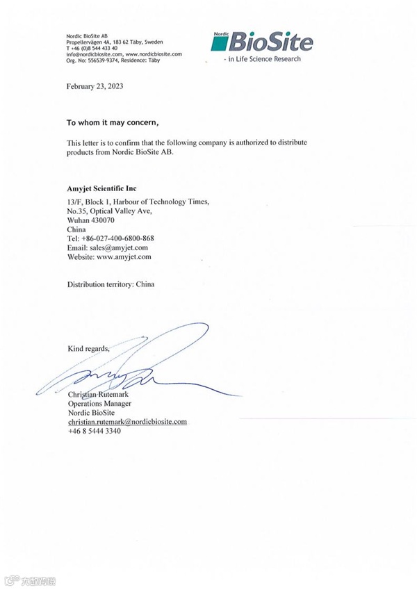 艾美捷科技有限公司将为中国客户提供最全面的Nordic BioSite的产品。下图为Nordic BioSite公司授权艾美捷科技有限公司(AmyJet Scientific Inc.)作为Nordic BioSite在中国区域的代理授权书。