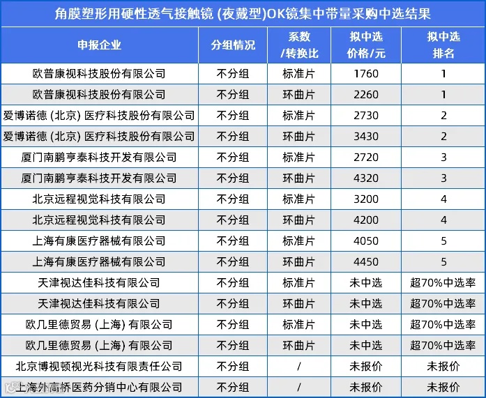 从拟公布的中选结果来看,欧普康视、爱博诺德 、厦门南鹏亨泰、北京远程视觉、上海有康等5家械企10款产品中选。其中欧普康视的 (夜戴型)OK镜标准片,集采拟中选价格降至1760元。据公开信息,一副国产OK镜的终端售价在0.8万元-1.5万元,进口OK镜在1万元-1.5万元。此次集采价格公布,意味着OK镜从万元时代,进入一千元时代。