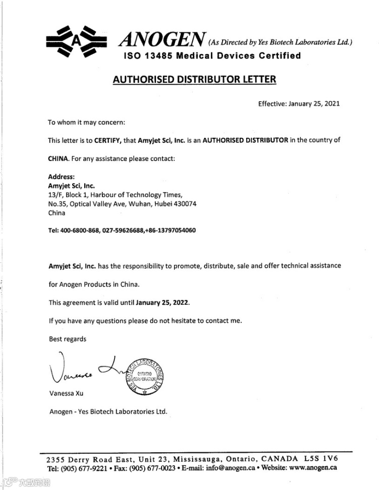 Anogen-Yes Biotech Laboratories Ltd. 创建于1989年, 位于加拿大多伦多近郊的著名高科技城市密西沙加市。Anogen是Yes Biotech Laboratories Ltd.(加拿大逸士生物技术研究有限公司)的商标及其在国际上的市场经销部门。Anogen-Yes Biotech Laboratories Ltd.通过广泛的技术平台设计和开发各种产品,包括单克隆和多克隆抗体,免疫测定试剂盒,匹配的抗体对,免疫球蛋白,生物活性肽,重组蛋白、基因工程/人源化抗体等等。致力于生命科学研究和帮助各种疾病的诊断和防治,包括炎症和自身免疫性疾病、心血管病和癌症等。Anogen自2000年以来已通过ISO 13485认证。其产品在严格质量控制标准下进行研发和生产, 并以公认的优质产品畅销世界各地。