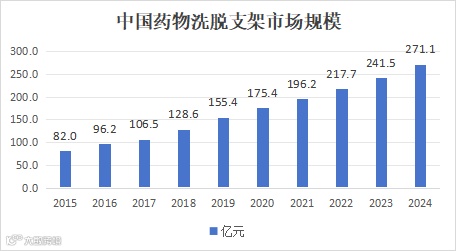 在心血管疾病患者数量增加,心血管介入治疗需求持续增长的背景下,本土医疗器械企业纷纷布局药物洗脱支架领域,加速实现药物洗脱支架国产化,同时促进药物洗脱支架行业市场规模增长。按出销售额统计,2015-2022年中国药物洗脱支架行业市场规模由82.0亿元增长至217.7亿元,年复合增长率14.97%,预计2024年将达到271.1亿元。