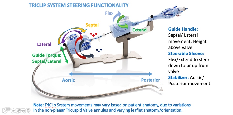 TriClip 系统利用了与 MitraClip 系统相同的夹取技术,临床医生可以将患者心脏每个皮瓣的一部分固定在一起,并根据每个患者的独特瓣膜定制手术程序。此外,雅培还专门为此设计了用于向三尖瓣植入的差异化输送系统,方便手术医生在固定前单独抓取。手术中,医生将通过股静脉把 TriClip 系统植入到患者心脏,采用缘对缘的技术将三尖瓣小叶的一部分夹在一起,减少血液的回流。