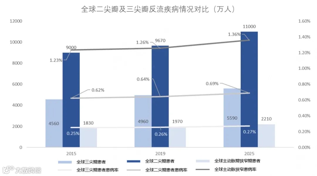根据沙利文披露的数据,全球三尖瓣反流患者人数仅次于二尖瓣反流患者,预计未来将影响5000万以上的世界人口;患病率方面(以全人口统计),三尖瓣反流的患病率在0.62%以上,仅次于二尖瓣反流、超过了主动脉狭窄患者。