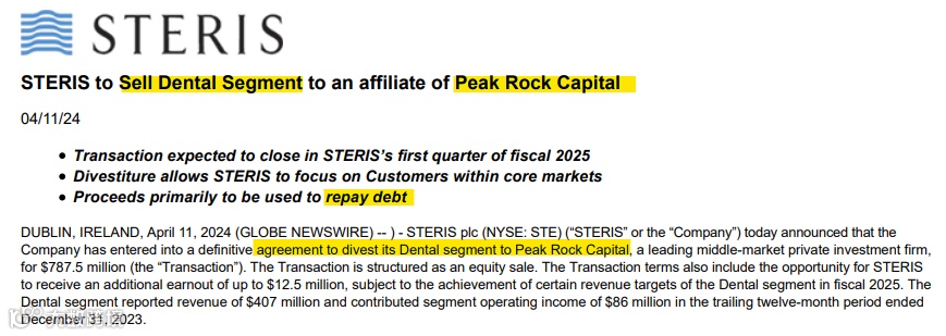 Steris思泰瑞医疗 (NYSE: STE) 今天宣布已达成最终协议,以 7.875 亿美元(约合56.99亿人民币)的价格将其牙科部门Hu-Fried (豪孚迪) 剥离给Peak Rock Capital (峰岩资本) 。