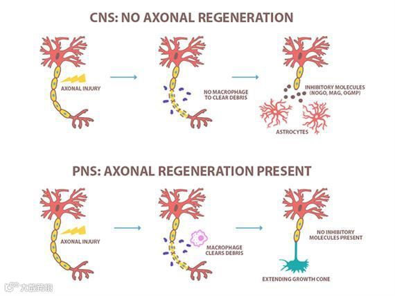 相反,而周围神经系统(PNS)中受损的轴突会再生。