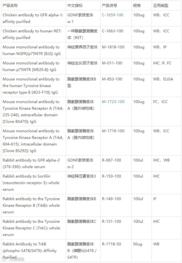 p75NTR是一种低亲和力的神经营养因子受体,所有神经营养因子都与之结合。它是肿瘤坏死超家族的成员。Trk家族包括TrkA,TrkB和TrkC,并且只与特定的神经营养因子结合,但有更高的亲和力。Trks介导神经营养因子的功能信号。