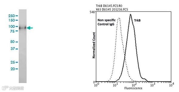 右图:通过流式细胞术分析人前列腺癌DU145细胞系中TrkB表达。DU145细胞用PBS洗涤两次,封闭:200 ug / mL正常绵羊IgG(20分钟),一抗:小鼠抗TrkB的单抗(货号M-853-100,每~ 106细胞约2μg)在冰上,二抗:山羊抗小鼠PE标记的二抗(1:100倍稀释),在室温下于黑暗中孵育20分钟。非特异性对照IgG,克隆X63(货号M-1249-100)在相同条件下(黑色虚线)用作阴性对照。流式细胞仪数据和结果是使用Orflo MoxiflowTM仪器和protocol生成的。
