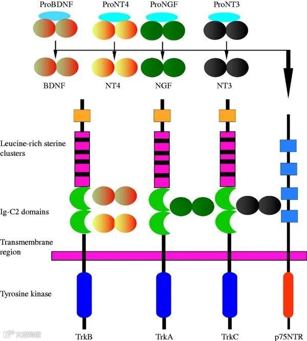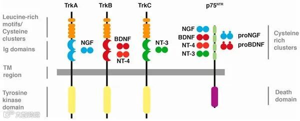 神经生长因子(NGF)结合TrkA,脑源性神经营养因子(BDNF)和神经营养因子4(NT-4)结合并激活TrkB,神经营养因子3(NT-3)结合并激活TrkC。
