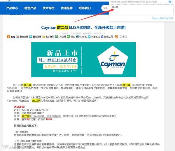 进入网页后,点击界面右上角的插件图标即可打开插件窗口,在该窗口内你只需要将希望高亮显示的关键字或短语输入进去即可在当前网页中高亮显示相应的词句。