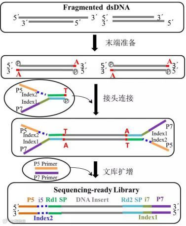 所谓DNA文库,实际上是许多个DNA片段,在两头接上了特定的DNA接头,形成的混合物。常规DNA建库包括四步: