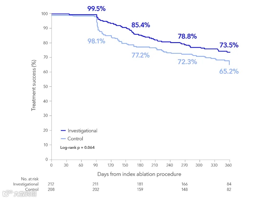 结果显示,美敦力的标测消融治疗具有良好的安全性,主要安全终点率为1.4%(强生为1.0%);在治疗程序上也表现出更高的效率(如手术时间和能量应用时间减少);接受美敦力标测消融治疗的 73.8% 的患者没有出现房颤复发,而接受强生治疗方案未出现房颤复发的患者仅为 65.8%。