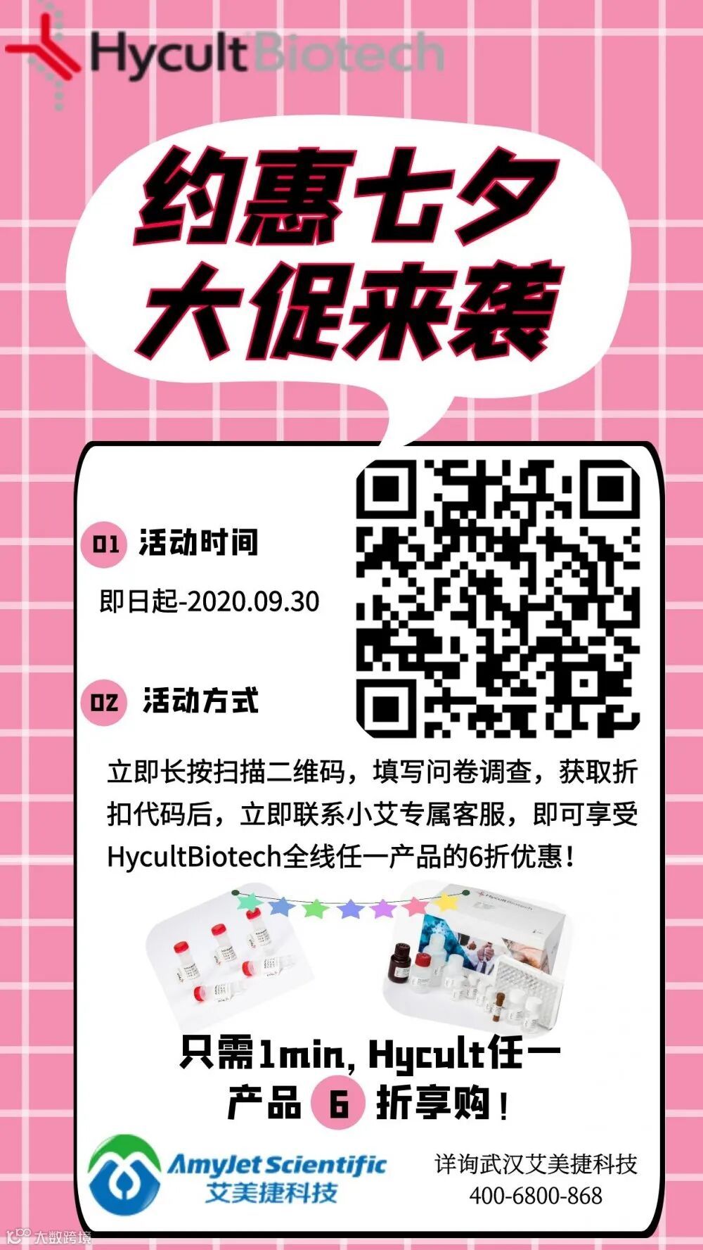 为答谢和回馈广大科研工作者们长期以来对武汉艾美捷科技有限公司的大力支持,艾美捷科技联合Hycult Biotech,携手推出:Hycult Biotech全线产品七夕大促,只需花费1min填写厂家的问卷,待厂家审核通过(或许很快or maybe long time),获取折扣代码后联系小艾专属客服,就能享受Hycult Biotech全线任一产品的6折优惠,每人仅有一次机会喔,还在等什么,心动不如行动吧。