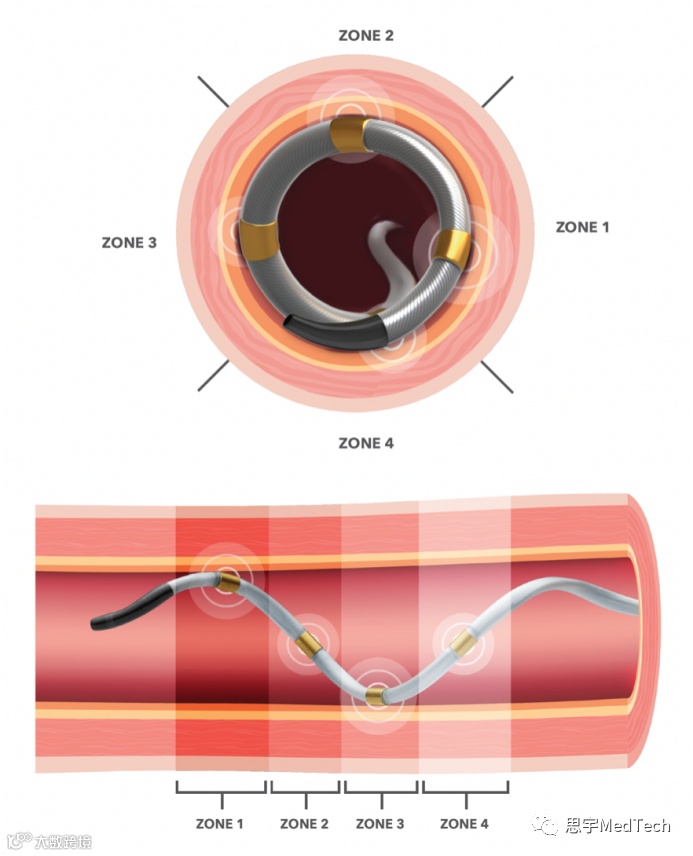 Symplicity Spyral™单一导管可消融的血管直径拓展为3-8mm,利用螺旋形电极模式,在肾动脉主干可完成全部4个象限的消融,在肾动脉分支可完成至少2个象限的消融。该系统可对主动脉、附属血管和分支血管进行消融,最大限度地提高完全去神经的概率,设计易于使用、快速交换、即插即用。