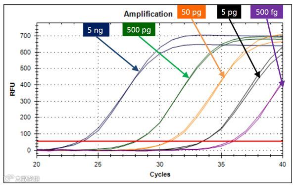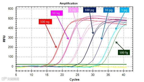 使用低丰度RNA定量试剂盒在皮克范围内进行RNA定量的灵敏度。代表性qPCR基线图显示了RNA标准品稀释梯度的扩增。可以从低丰度样品如液体活检样本(如血浆或尿液)中定量纯化RNA。可以定量低至500 fg的RNA。